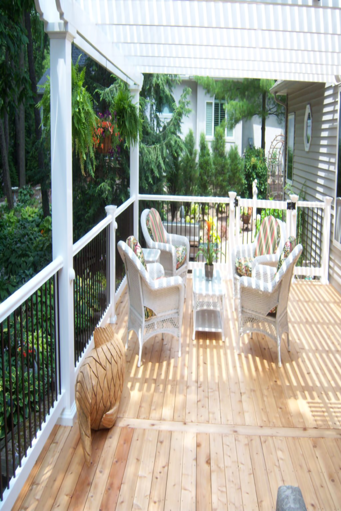 A simple wooden deck can be transformed into a gorgeous outdoor area by adding a pergola. Climbing vines can be used to cover the supports and slats of the building to provide more shade and incorporate a natural feature. To make alfresco meals even more delightful, hang outdoor string lights from the pergola.