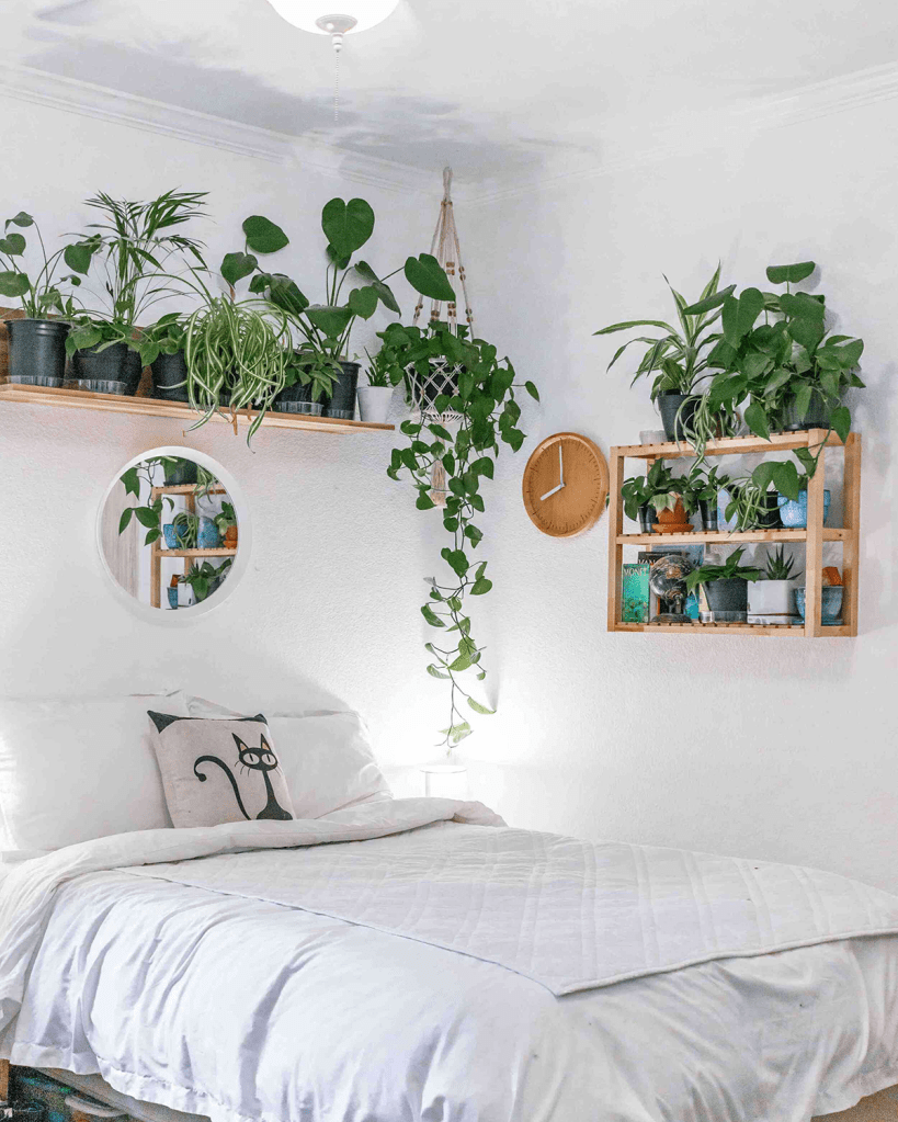 Making your wall a focal point with an Instagrammable shelf is the main goal of this bedroom decorating concept. Here, a gorgeous back wall display is created by potted and trailing plants, as well as art posters, candles, and ornaments.