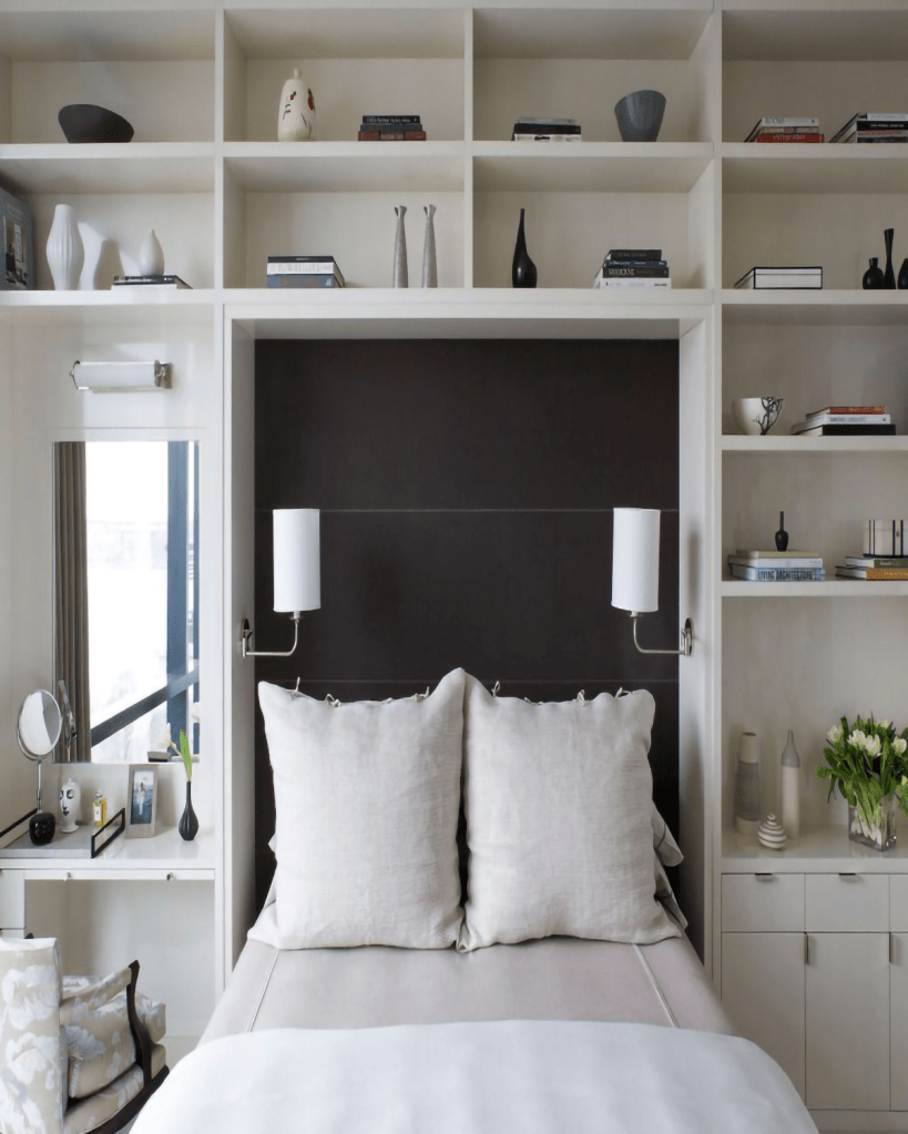 If your bedroom is small, you might want to replace the floor-hogging bedside table with a shallow, built-in bookcase. The compact nook offers storage for your favourite books and bedside necessities as well as a place to display an assortment of accessories, vintage finds, and bedroom-appropriate houseplants.